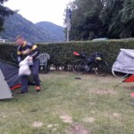 Der Radweg führte weitestgehend durch Wälder und bot wenig Abwechslung. Umso lustiger war es, als an wir an einer geschlossenen Bahnschranke Halt machen mussten. Wir entdeckten ein Telefon, mit dem man den Schrankenwärter anrufen musste, damit die Schranke (wenn möglich) geöffnet wurde. Also telefonierten wir uns siehe da, die Schranke ging tatsächlich auf. Super, so etwas hatten wir auch noch nicht gesehen. Man lernt eben doch nie aus! Nach der lustigen Telefon-Schranke ging es weiter durch den Wald und schon kamen Wackersdorf und Schwandorf wo wir eine Kaffeepause einlegten. Nun nur noch ein paar Kilometer bis zum See und schon war der erste Tag im Kasten. Aber am Campingplatz angekommen machte sich etwas Ernüchterung breit. Kein einziges Zelt war zu sehen und erst nach einigem Fragen und Hin und Her kam dann auch eine Dame die uns erzählte, dass der Zeltplatz „abgesoffen“ sei und wir zwar zelten könnten, aber sie kann für nix garantieren. Die festen Behausungen, die es noch gab, waren alle belegt. Also blieb uns nichts anderes übrig, als wieder nach Schwandorf zurück zu radeln (ungefähr 8 km) und dort eine Bleibe zu suchen.