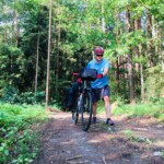 Für den ersten Tag war geplant bis zum Steinberger See zu radeln und dort auf dem Zeltplatz zu übernachten. Zunächst ging es auf gut vertrauten Wegen Richtung Oberpfalz. Zwischen Creußen und Schlammersdorf führte uns der Radweg durch ein kleines Waldstückchen. Hier ging es auf Grund der starken Regenfälle der Vortage zum Teil durch riesige Schlammpfützen. Bergauf war nichts mehr zu machen, wir mussten runter vom Rad und den Rest schieben. Das Gelände wär für die schmalen Reifen nicht tauglich. Anschließend sahen die Räder aus „wie Sau“ … :'( In Schlammersdorf (wo das berühmte Bier herkommt) gab es ein zweites Frühstück beim ortsansässigen Bäcker. Wir standen an unserem Stehtisch und ein paar Leute kamen herein um ihre Einkäufe zu erledigen. Obwohl wir vielleicht gerade mal 20 Kilometer von zu Hause weg waren verstanden wir kein Wort mehr. Der Oberpfälzer Dialekt ist schon etwas Eigenes… 😉 Nach der Stärkung ging es weiter Richtung Eschenbach, wo wir um den idyllisch gelegenen Rußweiher herum radelten. Ich bin dort öfters mal mit dem Rad unterwegs und es ist wirklich ein sehr schönes Fleckchen. Zu bemerken wäre auch, dass dort jährlich ein Triathlon mit Volks- und Sprintdistanz ausgetragen wird. Ich habe es zwar noch nicht geschafft dort mal zu starten, aber das steht definitiv noch auf meiner Agenda.